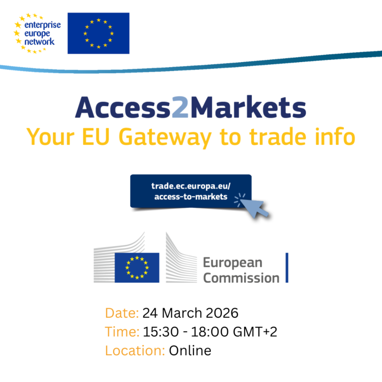 Το Enterprise Europe Network Κύπρου σας προσκαλεί σε μία ζωντανή διαδικτυακή εκπαιδευτική συνεδρία σχετικά με την ευρωπαϊκή πλατφόρμα Access2Markets της Ευρωπαϊκής Επιτροπής, η οποία θα πραγματοποιηθεί στις 24 Μαρτίου 2026.