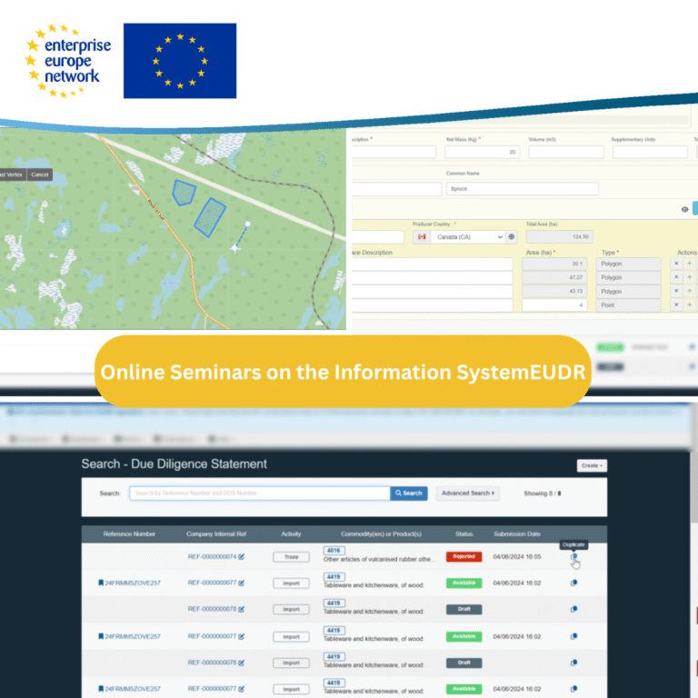 The Cyprus Chamber of Commerce and Industry, as the coordinator of the Enterprise Europe Network Cyprus, informs you that the European Commission (ENV DEFORESTATION Team) has announced the dates of the online training seminars related to the Information System of the EU Deforestation Regulation (EUDR), for the month of November. The dates are available on the European Commission’s website HERE.